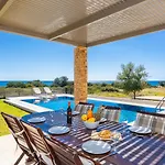 Neben den Annehmlichkeiten für Selbstversorger wie einer voll ausgestatteten Küchenzeile bietet die Villa Blue Wave Tria auch einen Essbereich und einen Essbereich im Freien. Die Küche verfügt außerdem über eine Kaffee-/Teemaschine, einen Kühlschrank und einen Herd.
